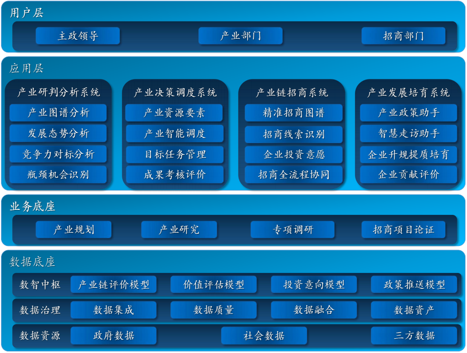 針對目前地方存在的產業分析缺乏全面性、產業招商缺乏精準性,通過構建全方位大數據底座和全環節數字化賦能,實現對地方產業工作從產業分析、到產業調度、產業招商、產業培育的全閉環支撐。