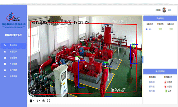 系統將網絡通信技術、視頻監控技術及圖像分析技術進行集成整合,能提供對生產一線井臺的遠程視頻監控,目標物體種類識別、穿越警戒線檢測、周界及入侵檢測、物品被盜和遺留檢測、人體行為檢測(如識別進入現場未佩戴安全帽和未穿工作服的員工)、現場煙火檢測等功能。